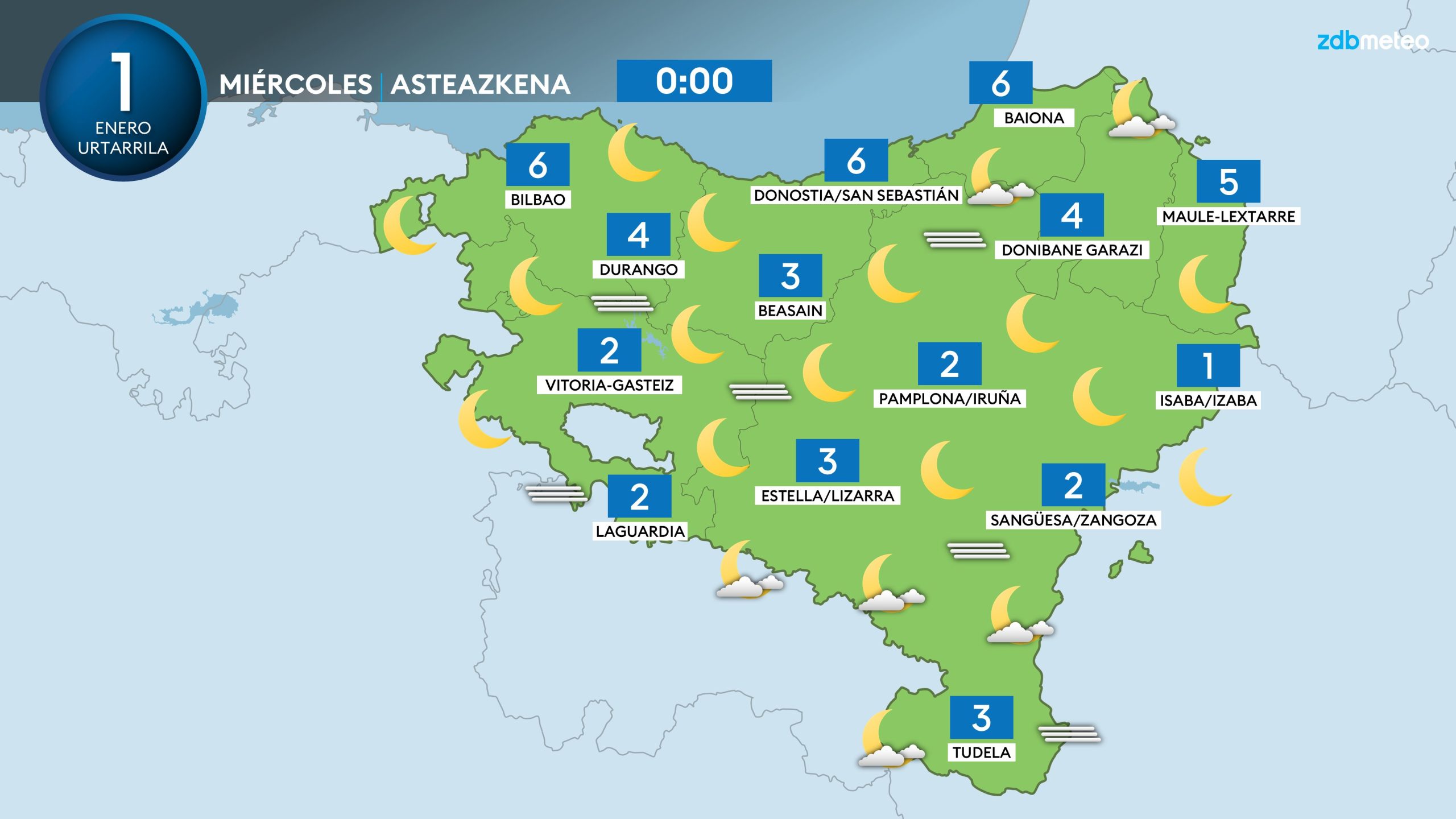 EGURALDIA | Comenzaremos el año sin apenas cambios. El miércoles volveremos a tener un día soleado y apacible. La única novedad será un incremento de la nubosidad media y alta al final del día. Frío a primeras horas, con algunas heladas en zonas del interior; cerca de la costa subirá algo la temperatura ya que el viento de componente sur ganará un poco de intensidad.