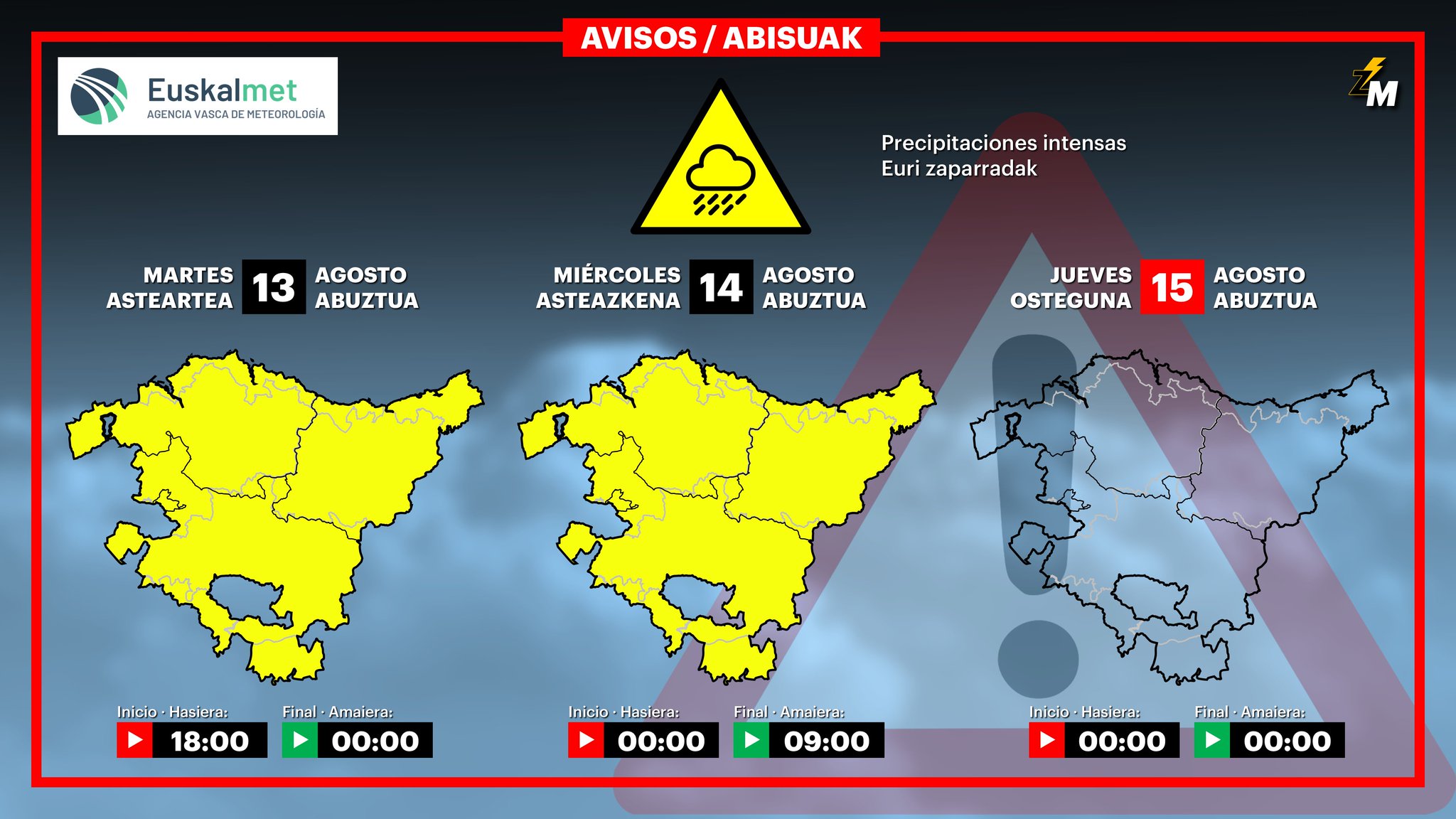 EGURALDIA | Hoy martes el ambiente estará más revuelto. Las nubes serán abundantes, y puede llover. Además, se mantendrá el ambiente inestable y se podrían dar chubascos tormentosos, sobre todo de cara a la tarde-noche. Soplará viento del noroeste y las temperaturas seguirán bajando, el descenso se notará especialmente en el sur, aunque las máximas seguirán rondando los 30 ºC, en el resto se situarán en torno los 24-26 ºC.