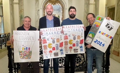 El alcalde Jon Iraola y el concejal de Cultura Patxi Lejardi han presentado la programación festiva en el Ayuntamiento donde también se ha dado a conocer el cartel anunciador de los Aratosteak 2024, entre los casi 120 carteles que han participado en el concurso; el ganador ha sido el elaborado por María Ortiz Baños y que lleva como título “Mozorro lehiaketa”. En la categoría de 11 a 14 años, la ganadora ha sido Jare Arzuaga Ibarretxe con “Aratosteetako oroitzapenak” y por último, en la categoría de hasta 10 años, la ganadora ha sido Ane Plaza Ubera con “Karnabalak airean”.