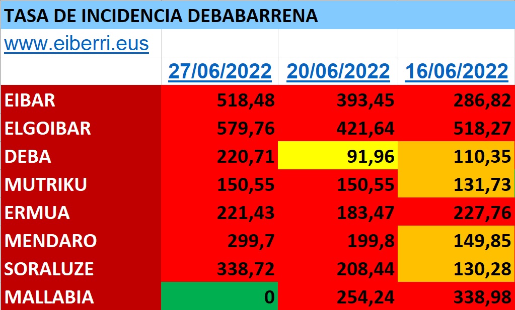En cuanto a la tasa de incidencia a excepeción de Mallabia que cuenta con una tasa 0, el resto de la comarca supera los 150 y en el caso de Eibar y Elgoibar sobrepasando los 500.