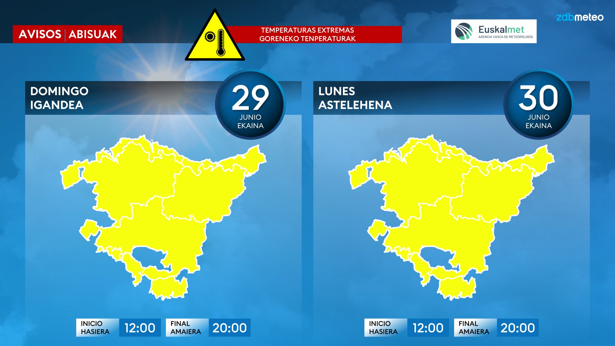 EGURALDIA | El calor será más intenso según pasen las horas y los días. Por ello, debido a las altas temperaturas, Euskalmet activará el aviso amarillo para hoy domingo y mañana lunes. Este domingo el mercurio se quedará en los 35 grados, pero mañana podrá rozar los 40.