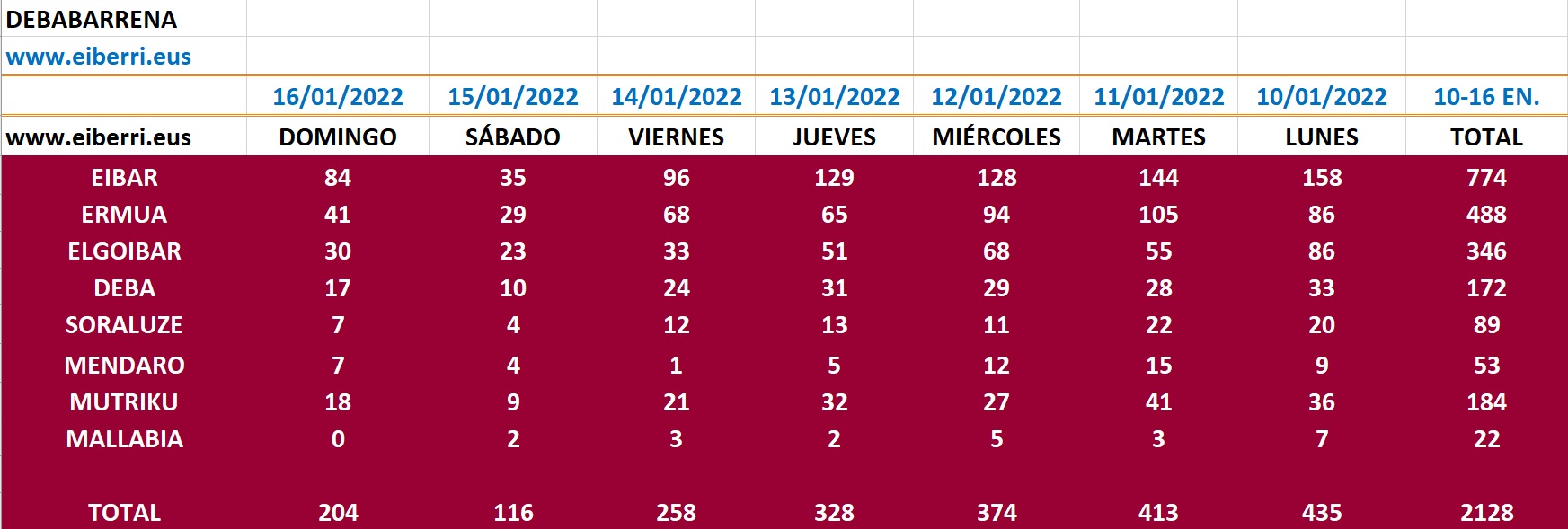 DEBABARRENA.- Esta semana se ha notado un ligero descenso en los contagios en Debabarrena y si la semana anterior se registraban 3265 en toda la semana, ésta ha finalizado con 2128, de los cuales 906 se han detectado de jueves a domingo. Por municipios, Eibar ha sumado 344, Ermua 203, Elgoibar 137, Deba 82, Mutriku 80, Soraluze 36, Mendaro 17 y Mallabia 7.