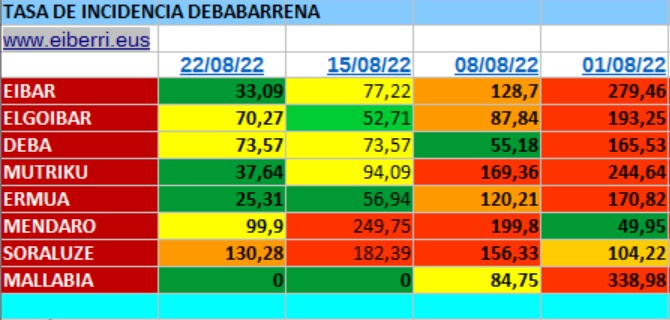 DEBABARRENA | La comarca registró la semana pasada 17 positivos, los mismos que la anterior. Una situación que se refleja en la tasa de incidencia ya que Debabarrena no tiene ningún municipio en rojo. Cuatro están en verde, tres en amarillo y uno en naranja.