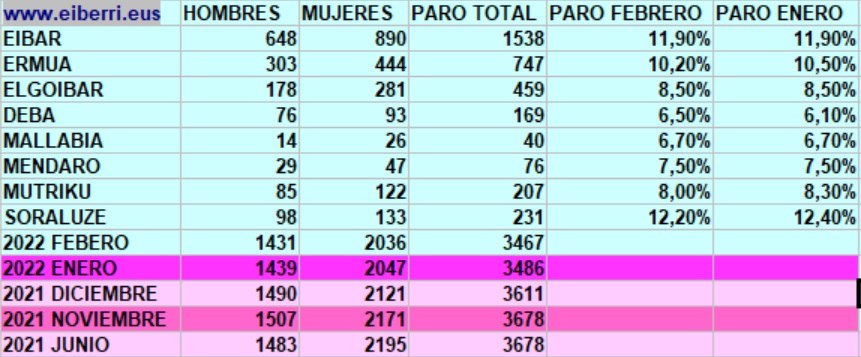 DEBABARRENA |El segundo mes del año refleja unos datos ligeramente más positivos que enero en la comarca, aunque las variaciones son mínimas. En febrero en la comarca se registraron 3.467 desempleados frente a los 3.486 del mes de enero, es decir, 19 personas han conseguido un empleo en las últimas semanas. Por localidades Ermua, Mutriku y Soraluze consiguen mejorar sus datos, frente a Deba donde empeora la tasa del paro. En el resto de localidades como en Eibar, Elgoibar y Mallabia el porcentaje no ha variado.