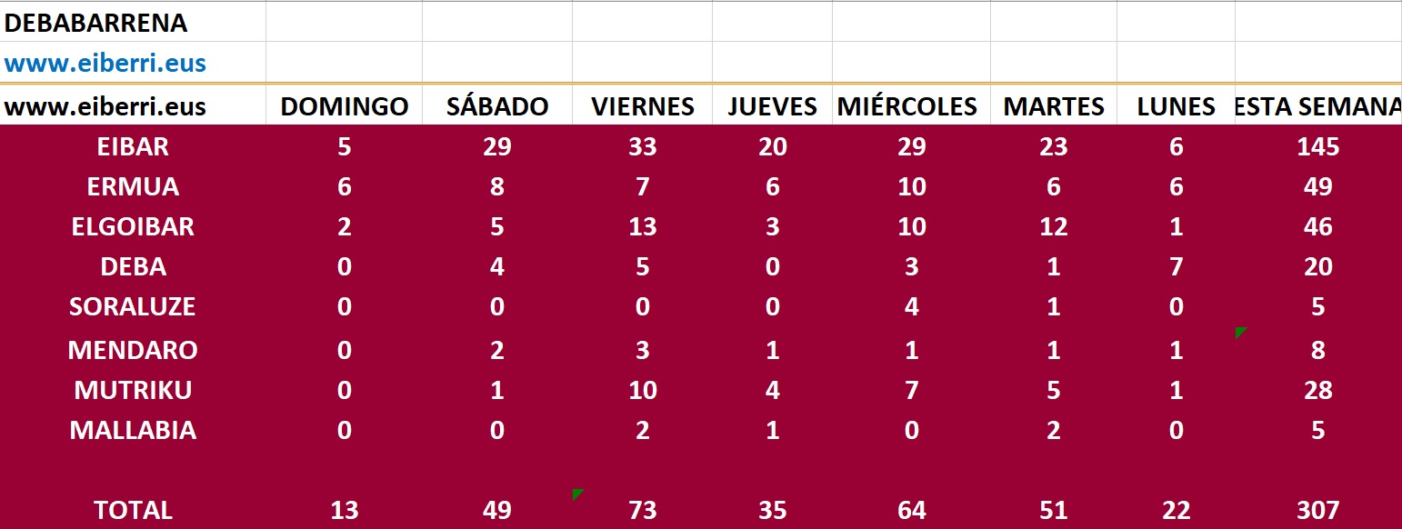 DEBABARRENA.-A lo largo de este fin de semana en Debabarrena se han detectado 135 nuevos casos positivos, de manera que la semana ha finalizado con 307 casos, 10 menos que la semana anterior.