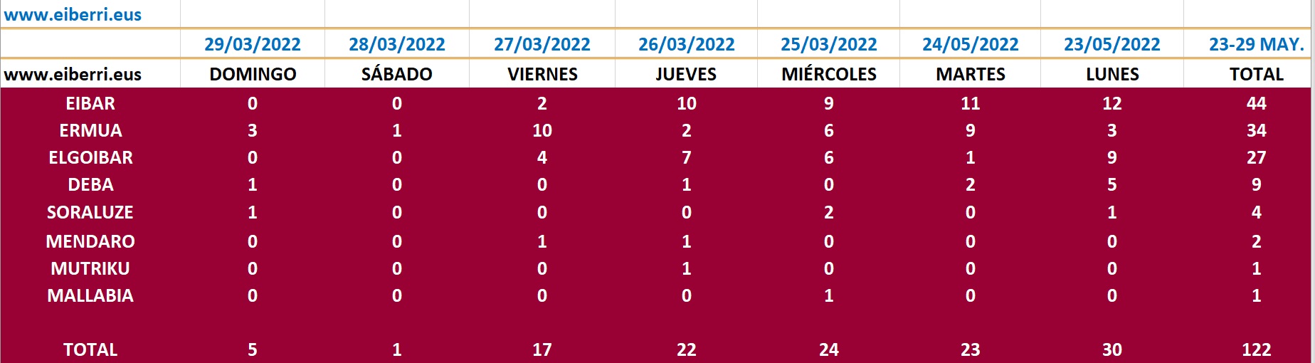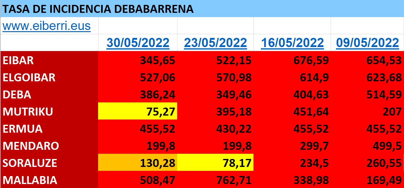 DEBABARRENA| Aunque el conteo de fallecidos continúa en Euskadi, los casos de coronavirus siguen descendiendo al menos en Debabarrena. Así, del 23 al 29 de mayo se registraron un total de 122 casos, 22 menos que la semana anterior. Por municipios, Eibar registró 44, Ermua 34, Elgoibar 27, Deba 9, Soraluze 4, Mendaro 2 y Mutriku y Mallabia uno cada.