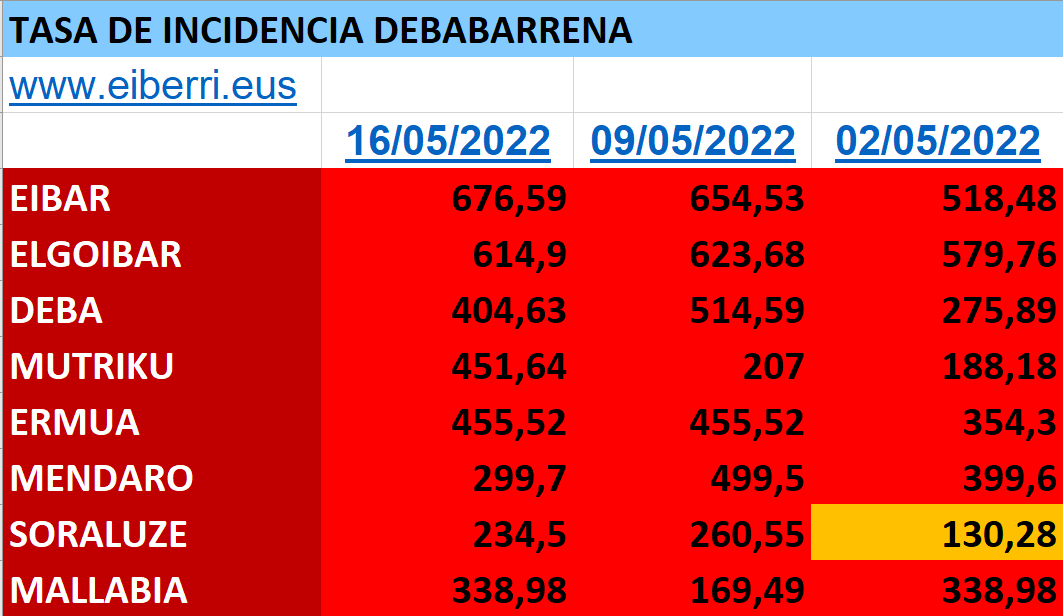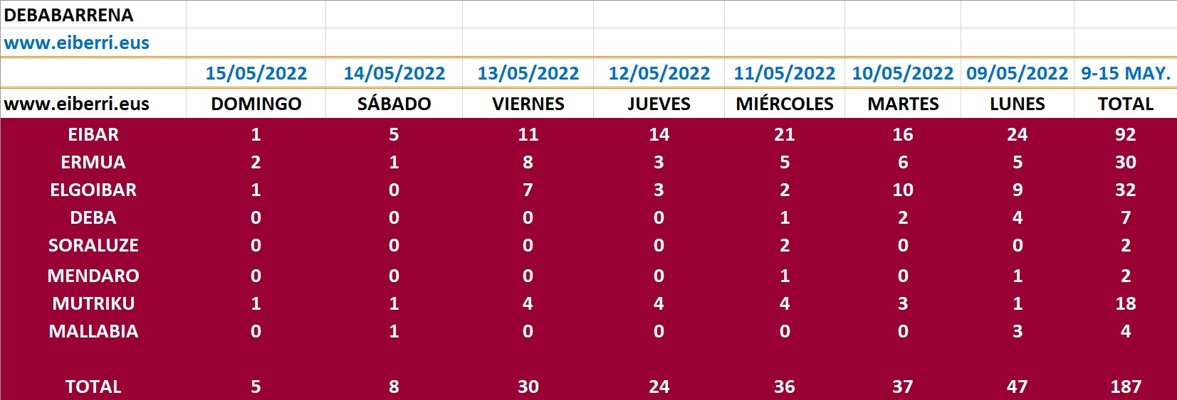 DEBABARRENA| La comarca de Debabarrena registró la semana del 9 al 15 de mayo un total de 187 casos, 17 menos que en la anterior. Por municipios, Eibar contabilizó 92, Elgoibar 32, Ermua 30, Mutriku 18, Deba 7, Mallabia 4 y Soraluze y Mendaro 2 cada.