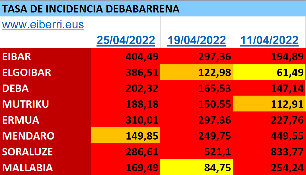 DEBABARRENA| Los contagios han vuelto a ascender en Debabarrena con 29 positivos más que la semana anterior. Así del 18 al 24 de abril se registraron un total de 131 casos frente a los 102 de la semana anterior.