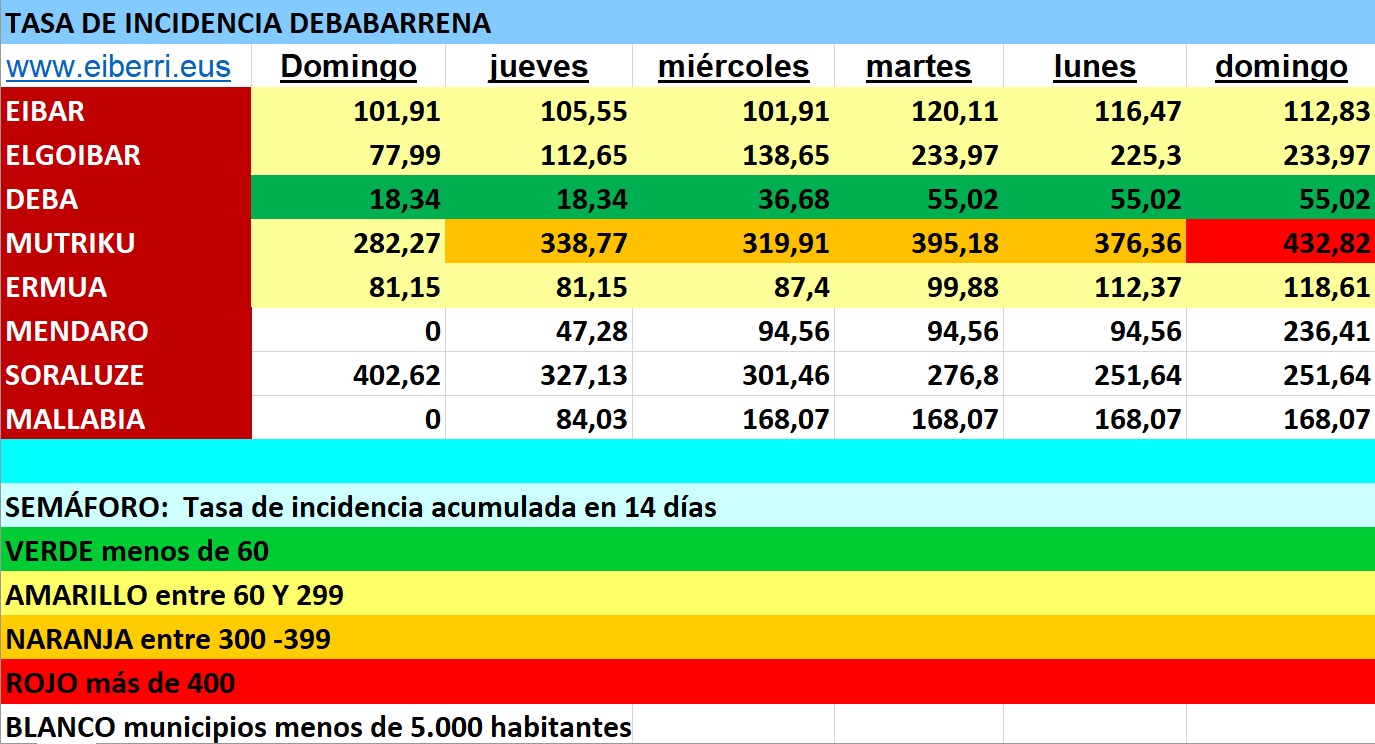 DEBABARRENA.- Debabarrena ya es de color amarillo y verde. Y es que la tasa de incidencia baja excepto en Soraluze que supera los 400 mientras que Mendaro y Mallabia tienen una tasa 0.