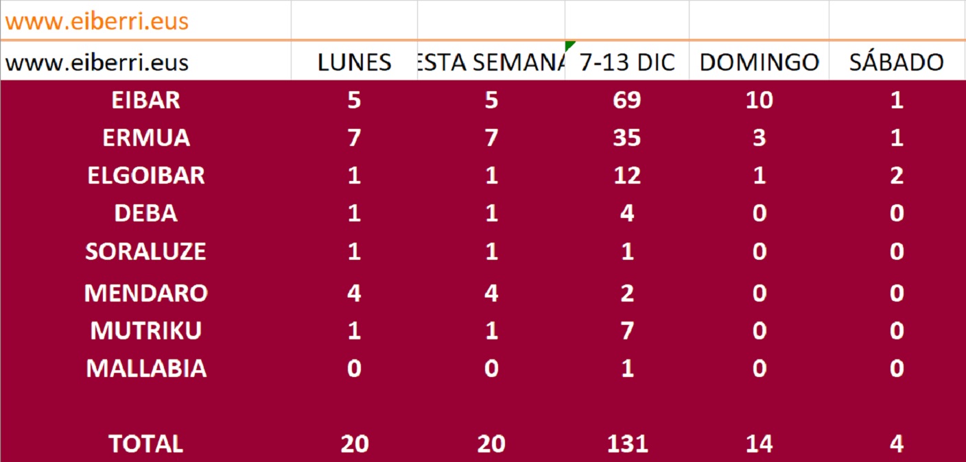 DEBABARRENA.- Debabarrena comienza la semana con 20 nuevos casos de coronavirus tal y como recoge el boletín de Osakidetza. Por municipios, Ermua registró ayer 7 casos, Eibar, 5, Mendaro 4 y Deba, Elgoibar, Mutriku y Soraluze uno cada uno.
