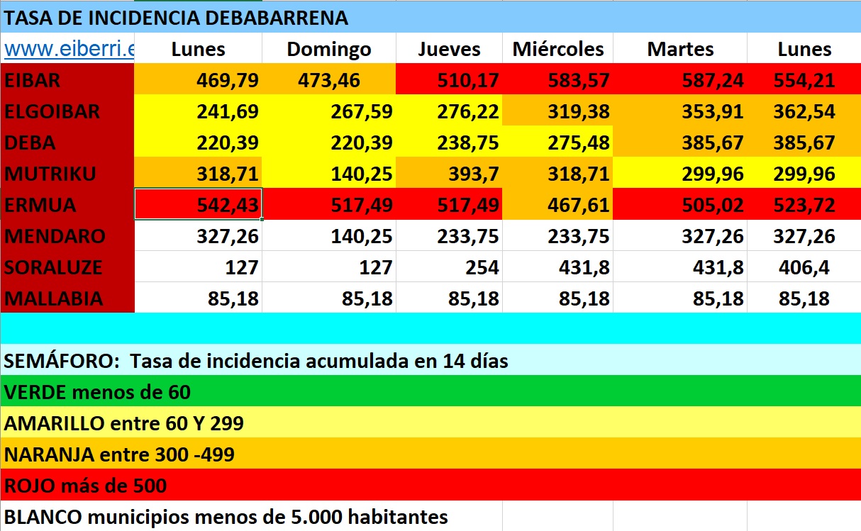 En cuanto a la tasa de incidencia en municipios de más de 5.000 habitantes, Ermua sigue en zona roja, Eibar y Mutriku en naranja y Deba y Elgoibar en amarillo.