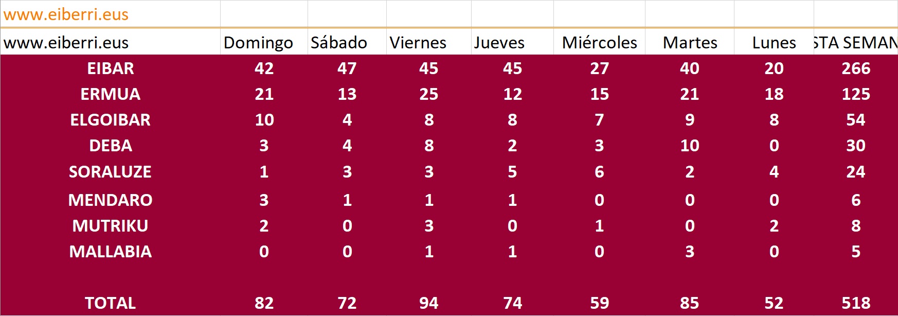 Por municipios, Eibar ha contabilizado 134, Ermua 59, Elgoibar 22, Deba 15, Soraluze 7, Mendaro y Mutriku 5, y Mallabia 1. En cuanto a la tasa de incidencia ha subido en Eibar, Deba y Ermua mientras que ha bajado en Elgoibar y Mutriku,