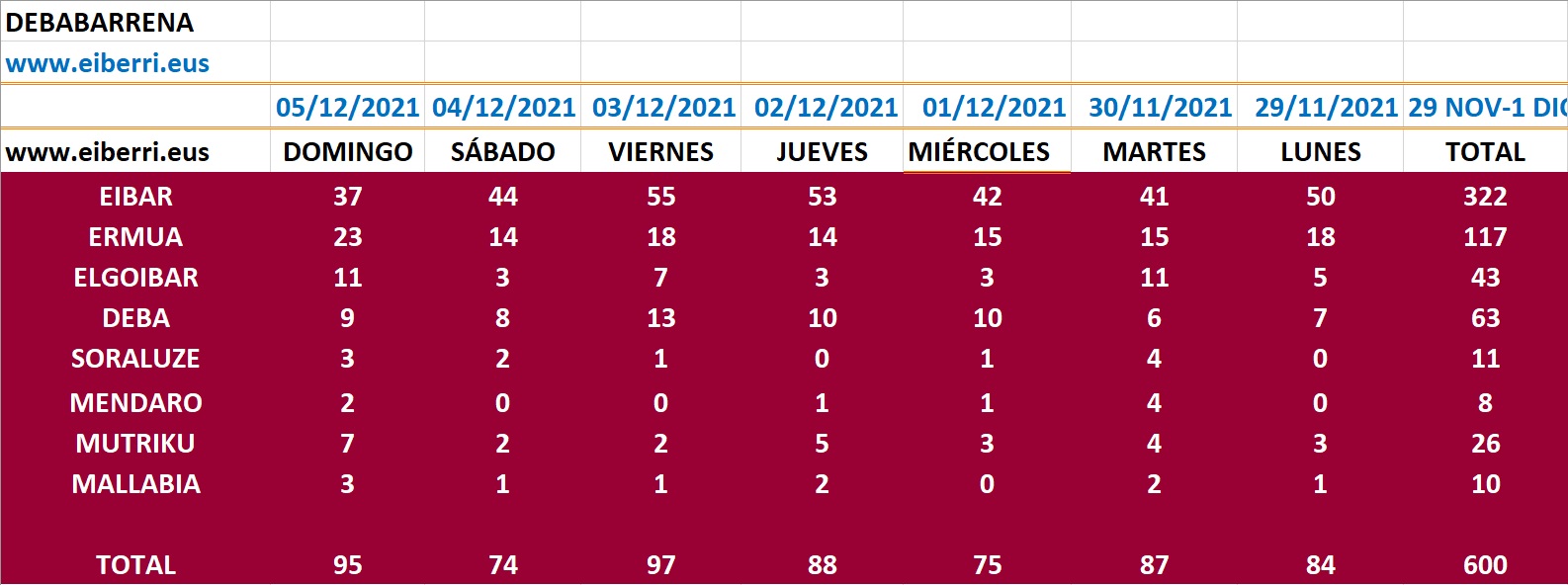 DEBABARRENA.- Continúa la tendencia al alza de las últimas semanas, y en esta última en Debabarrena se han detectado 600 casos de coronavirus frente a los 462 de la semana anterior. Entre el jueves y domingo se han registrado 354 casos de los cuales 189 han sido en Eibar, 69 en Ermua, 40 en Deba, 24 en Elgoibar, 16 en Mutriku, 7 en Mallabia, 6 en Soraluze y 3 en Mendaro.