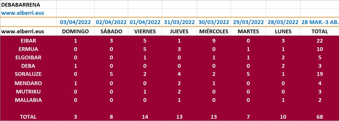 Por municipios, Eibar registró 22, Soraluze 19, Ermua 10, Elgoibar 5, Mendaro 4, Deba y Mutriku 3 y Mallabia 2.