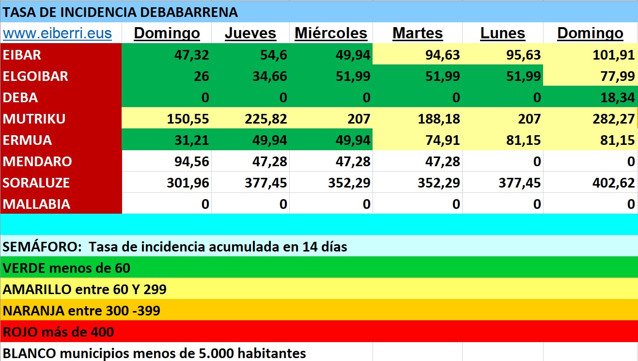 DEBABARRENA.- A la espera de lo que diga el LABI de mañana martes la situación de la pandemia en Debabarrena sigue mejorando registrando tan solo 5 casos durante el fin de semana. Los municipios con casos detectados de coronavirus han sido Soraluze con 2 y Mutriku, Mendaro y Eibar con 1 cada.