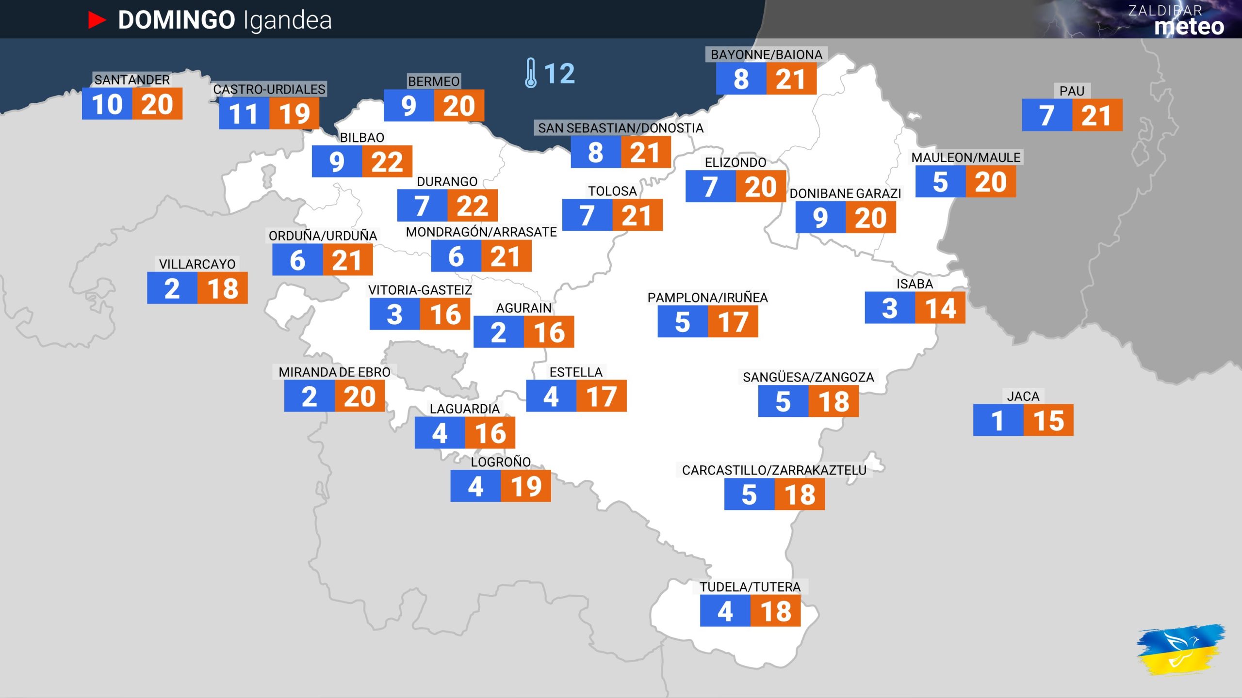EGURALDIA | El viento del sureste verá incrementada su fuerza el domingo y ello influirá en las temperaturas. En general será una jornada soleada. Las temperaturas máximas subirán un poco más, donde se superarán los 20 grados.
