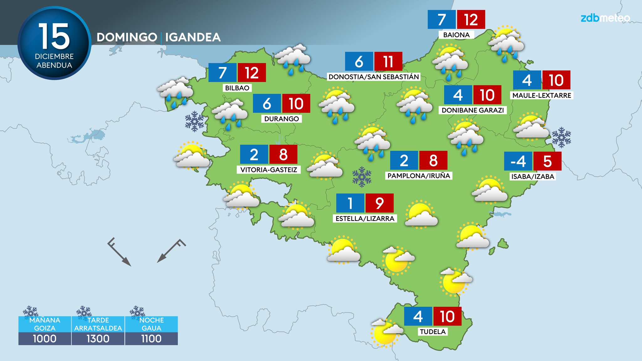 EGURALDIA | Durante la primera mitad del domingo el tiempo seguirá por parecidos derroteros. Tendremos abundante nubosidad de tipo bajo y estas nubes bajas dejarán algunas precipitaciones. La cota de nieve seguirá situada entre los 1.200 y los 1.400 metros. A lo largo de la tarde la lluvia cesará y se abrirán algunos claros. Viento del norte durante las horas centrales del día, quedará variable al final.