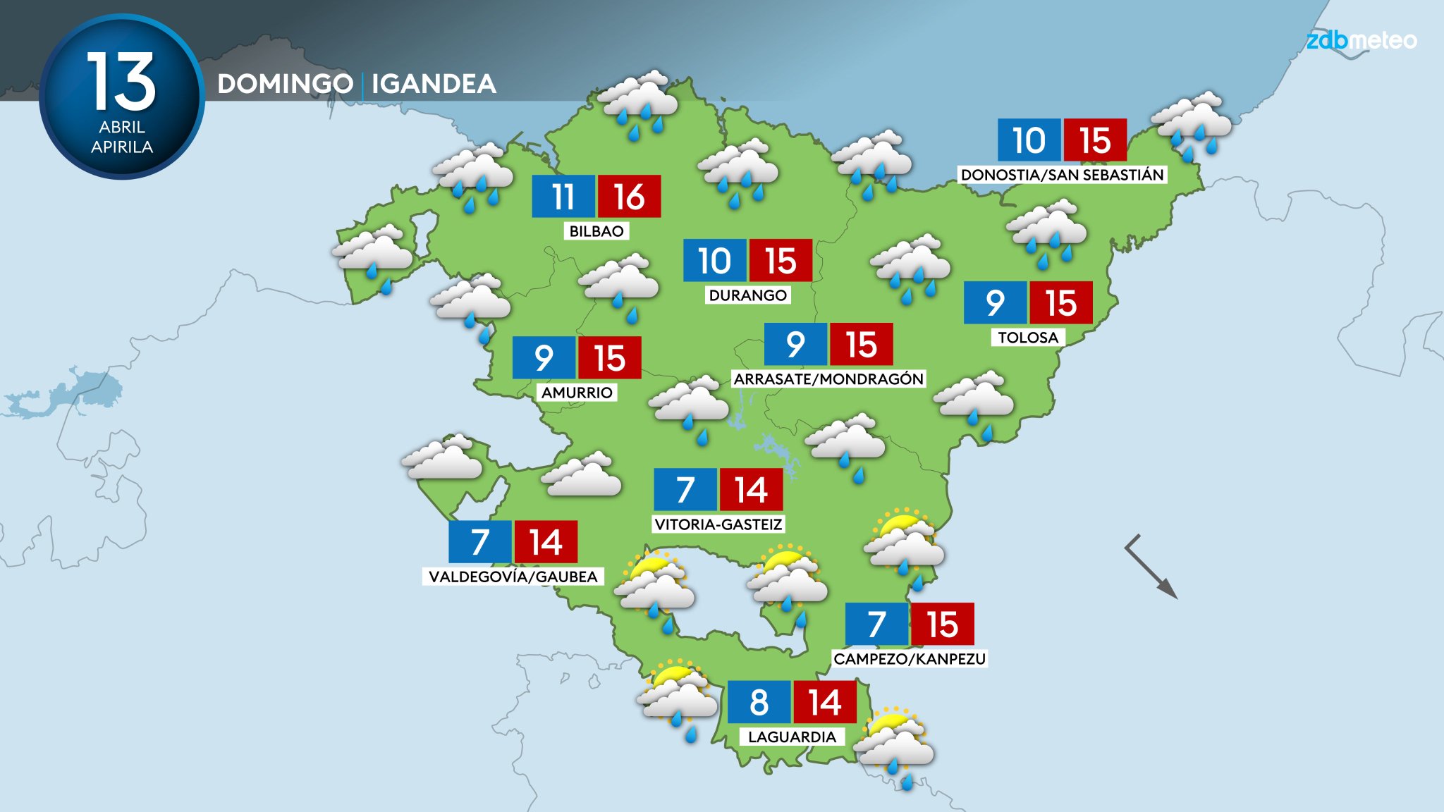 EGURALDIA | El domingo ambiente gris, con abundante nubosidad y descenso de los termómetros. Las temperaturas bajarán en todo el territorio con el viento soplando flojo del noroeste y del norte, quedando las máximas en torno a los 14-16 grados. Los cielos permanecerán cubiertos durante casi toda de la jornada y se producirán lluvias débiles y dispersas, sobre todo durante la primera mitad del día. Podrían darse chubascos puntuales algo más intensos, sobre todo en zonas de montaña del interior.