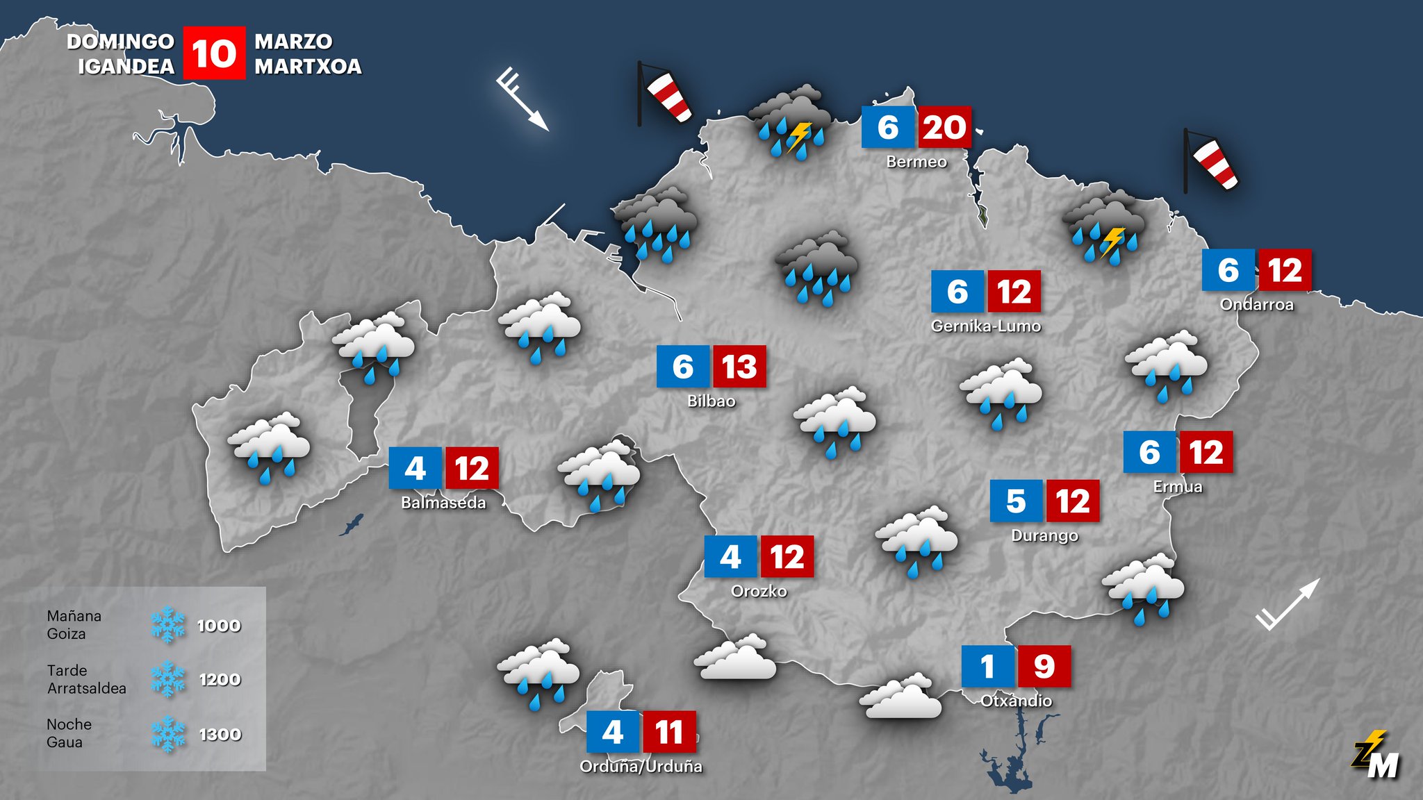 EGURALDIA | El domingo a primeras horas puede llover algo y lo hará con fuerza en la costa. Debido a ese cambio del viento, las lluvias más abundantes se trasladarán a la mitad norte. Ocasionalmente los chubascos podrán venir acompañados de tormenta. La cota de nieve comenzará en unos 1000 m y terminará subiendo a 1200 m durante la tarde. Las temperaturas serán algo más bajas.