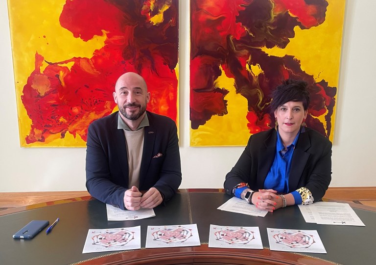 Imagen de la rueda de prensa celebrada para presentar el IV Plan de Convivencia y Diversidad 2024-2028. Jon Iraola, alcalde de Eibar, y Sonia Archeli, concejala de Servicios Sociales.