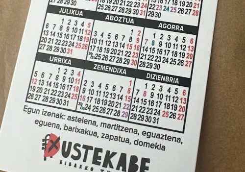 EIBAR | Eibarko euskerian idatzittako poltsikoko egutegixak atara dauz Ustekabek, herrittarren artian duan banatzeko. 2013an abiatutako ekimena berreskuratu dau Eibarko txarangiak, gure herriko berbak ezagutzera emoten laguntzeko. Horretarako, poltsikoko 3.000 egutegi banatuko dauz,
