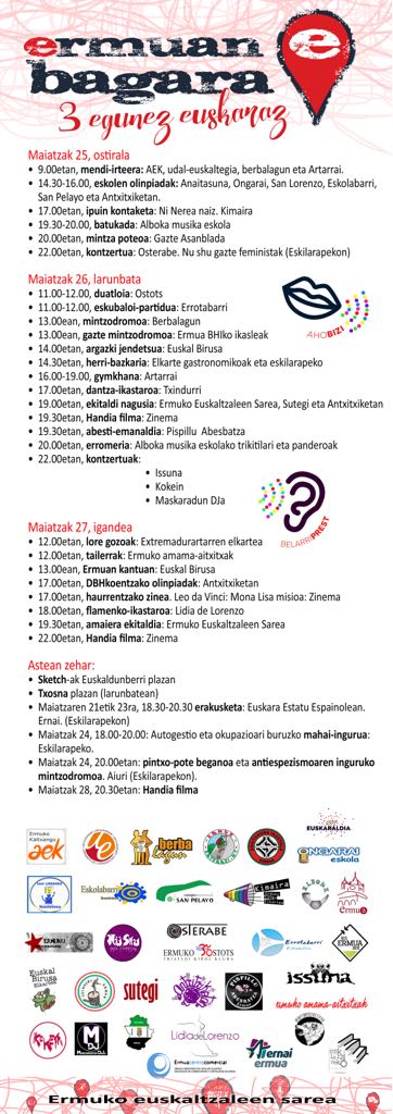 Horrela, bost eskolen arteko olinpiadak, ipuin kontaketak, batukada eta NÜ SHU Ermuko gazte feministaren kontzertua antolatu dute gaurkorako. Bihar, maiatzak 26an duatloia, zinema edota Pispillu Abesbatzaren kontzertua ere egongo da eta igandean eta hurrengo astean zehar ere ekitaldiak ospatuko dira.