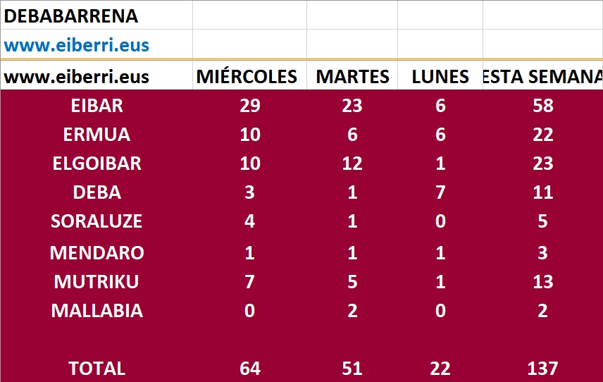 DEBABARRENA.- Siguen subiendo los casos positivos en Debabarrena, ayer fueron 64 los detectados. Por municipios, Eibar registró ayer 29 casos, Ermua y Elgoibar 10 cada uno, Mutriku 7, Soraluze 4, Deba 3 y Mendaro 1.
