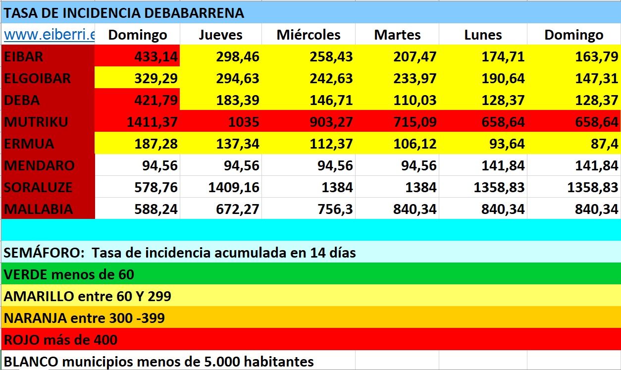 Como consecuencia de ello Eibar y Deba ha rebasado la tasa de 400 entre los municipios con más de 5.000 habitantes y han pasado a la zona roja.