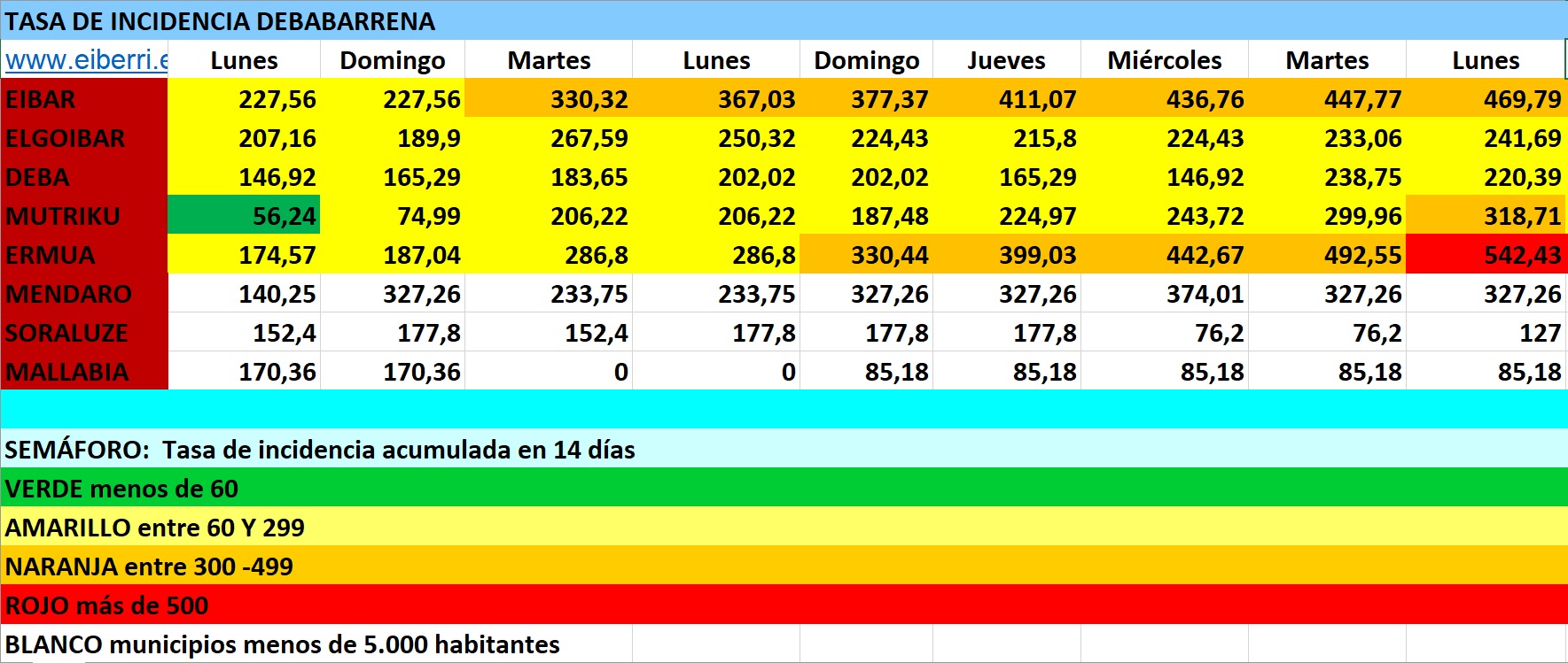 DEBABARRENA.- El color verde del semáforo de la tasa de incidencia ha aparecido en Debabarrena con Mutriku, es decir, la tasa de incidencia es inferior a 60 en municipios de más de 5.000 habitantes. Junto con Urnieta y Usurbil son los primeros municipios de Gipuzkoa en pasar a la zona verde tal y como se puede apreciar en el boletín de Osakidetza.