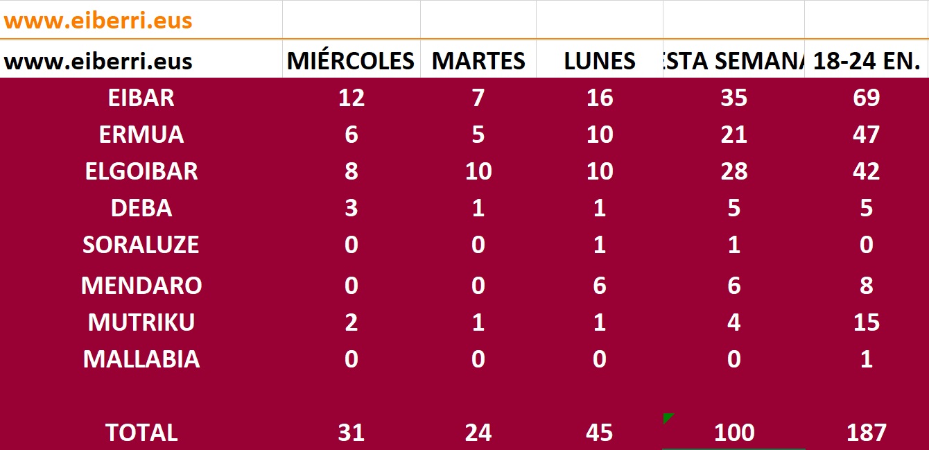 Por municipios, Eibar contabilizó ayer 12 casos, Elgoibar 8, Ermua 6, Deba 3 y Mutriku 2