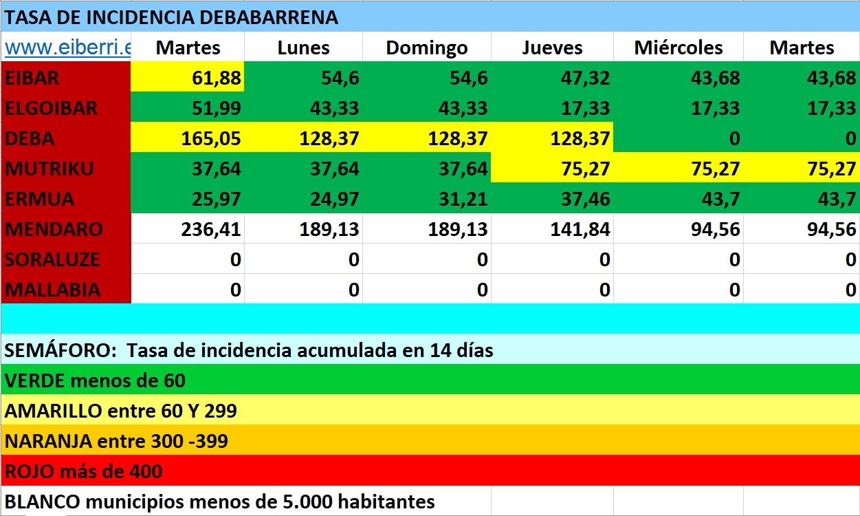 Como consecuencia de ello la tasa de incidencia en municipios de más de 5000 habitantes sube en Deba y Eibar y éste último entra en la zona amarilla.