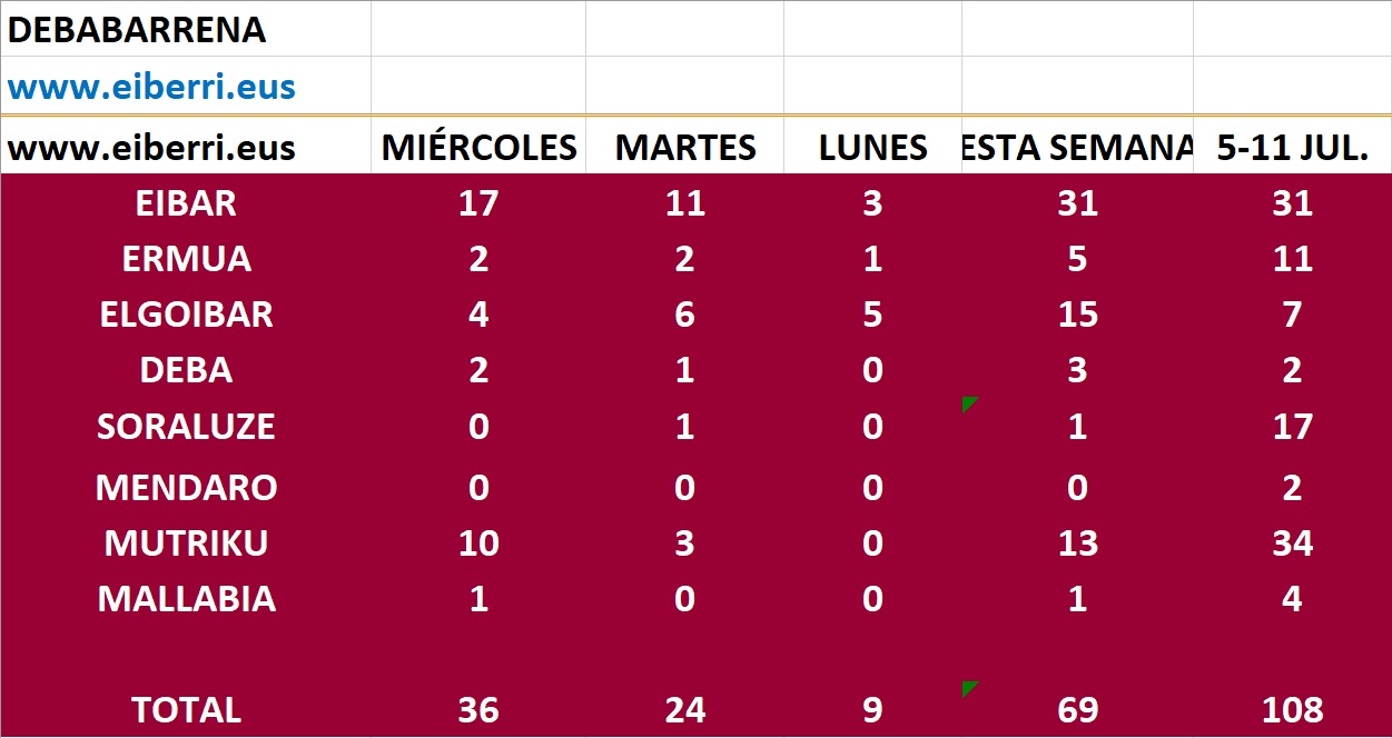 DEBABARRENA.- Siguen subiendo los casos en Debabarrena con 36 registrados ayer. 17 de ellos se detectaron en Eibar, 10 en Mutriku, 4 en Elgoibar, 2 en Deba y Ermua y 1 en Mallabia.