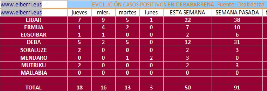 DEBABARRENA.- La comarca sumó ayer 18 nuevos casos por Covid19. Eibar registró 7 y Deba 5, mientras que Soraluze y Mutriku detectaron dos nuevos casos y Elgoibar y Ermua 1 más. En cuatro días la comarca suma medio centenera d enuevos contagios.