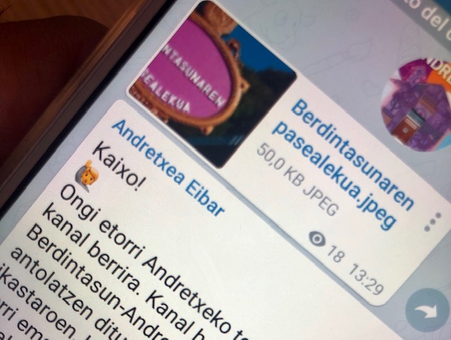EIBAR.- El Área de Cultura del Ayuntamiento de Eibar y el Servicio de Igualdad-Andretxea disponen, desde esta semana, de sus propios canales de comunicación en la aplicación de mensajería instantánea Telegram para enviar información a sus seguidores sobre los actos, actividades, cursos o talleres que organicen. En el caso de Cultura, el nombre del nuevo canal es “Eibarko Kultura”, mientras que en el caso del Servicio de Igualdad, el nombre elegido es “Andretxea Eibar”.