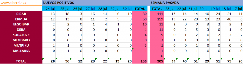 DEBABARRENA.- A pesar de estar controlados los focos los positivos por coronavirus sumaron 20 casos nuevos en el día de ayer en Debabarrena y Ermua. Así Eibar registró 10 casos, Ermua 9 y Soraluze 1 tal y como recoge el boletín de hoy de Osakidetza.