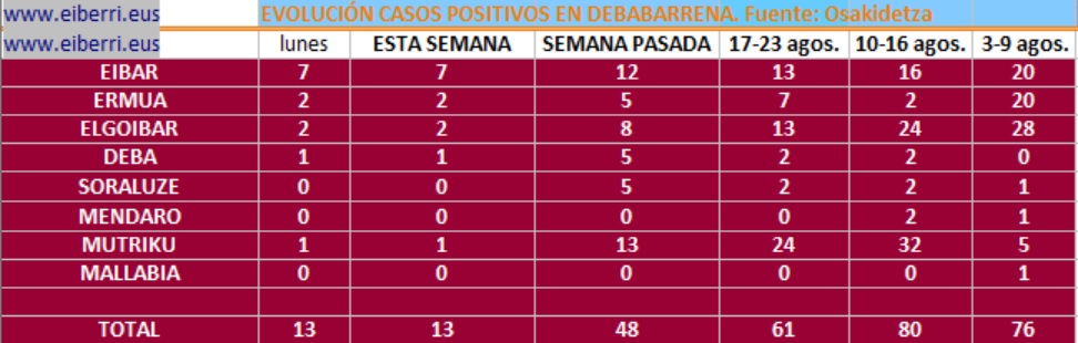 DEBABARRENA.- En las últimas horas la comarca de Debabarrena ha registrado trece nuevos casos, más de la mitad, 7 en Eibar, el resto repartidos entre Elgoibar y Ermua con dos y Deba y Mutriku con un caso más cada uno de ellos.