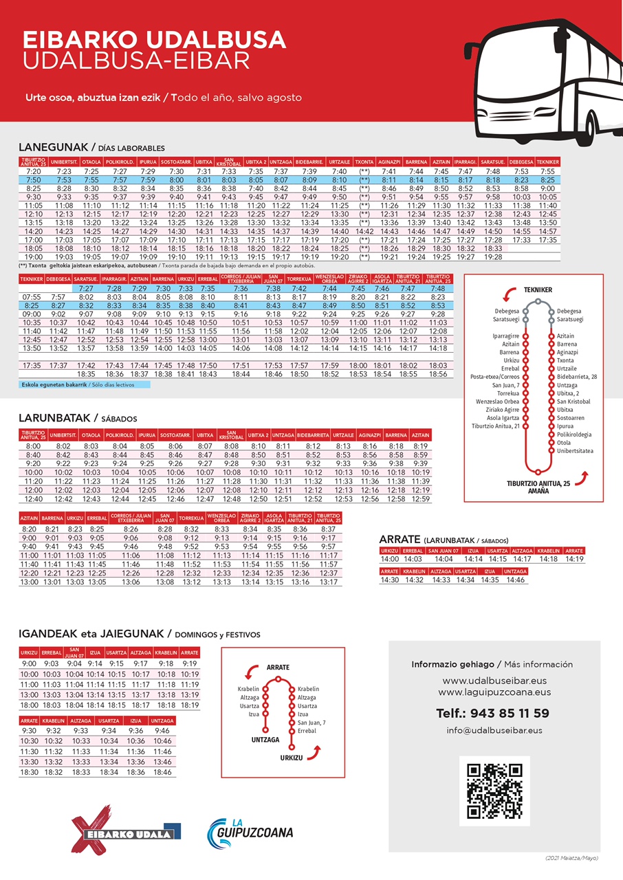 Los cambios de horarios se están dando a conocer estos días mediante la colocación de carteles en las paradas, así como con la entrega a las personas usuarias de un tríptico en el que se detallan los nuevos horarios y rutas. Dicho tríptico también puede obtenerse en la oficina de atención a la ciudadanía, PEGORA, del Ayuntamiento de Eibar.