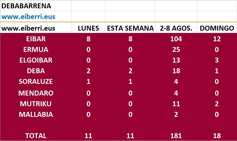 DEBABARRENA.- En las últimas 24 horas se han detectado 11 nuevos casos en Debabarrena. Por localidades, Eibar registró 8 casos, Deba 2 y Soraluze 1.