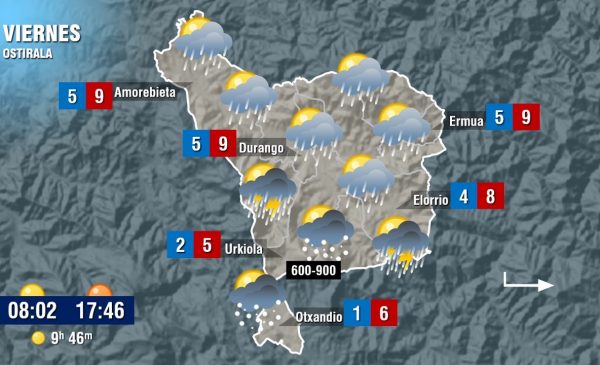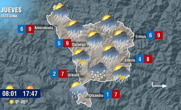 EGURALDIA.- Vuelve el invierno con la sexta borrasca de noviembre. Euskalmet ha activado la alerta amarilla por lluvias persistentes, tormentas con granizo y por nieve, ya que la cota irá descendiendo según pasen las horas del jueves y viernes. Todo ello como consecuencia de la entrada de una bolsa de aire frío que dejará espesores en torno a los 30 o 40 centímetros en torno a los 1.000 metros y de 5 a 10 cm en altitudes alrededor de los 800-900 metros.