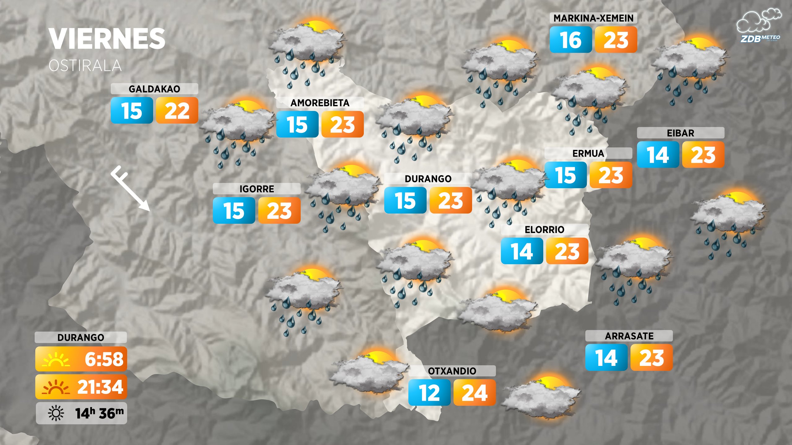 De momento el viernes el tiempo será tranquilo hasta la tarde. Por la mañana se irán alternando algunos intervalos nubosos con ratos de sol y se formarán algunas nieblas matinales. A lo largo de la tarde las nubes irán a más desde oeste y a últimas horas de la tarde y por la noche lloverá. El viento será variable y flojo por la mañana, pero se fijará del noroeste en las horas centrales. Las temperaturas apenas variarán.
