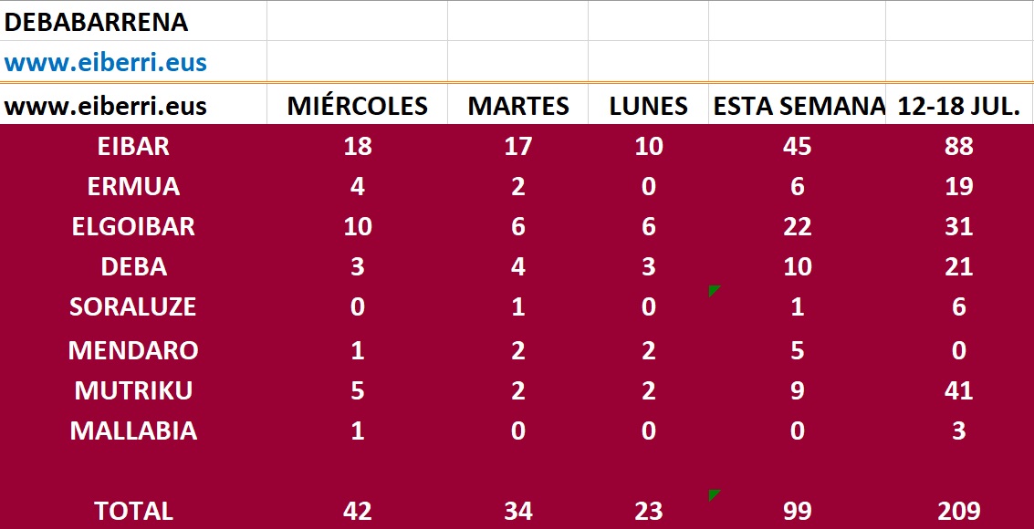 DEBABARRENA.- Continúa imparable la pandemia en Debabarrena con los 42 casos registrados a lo largo del día de ayer. 18 de ellos se detectaron en Eibar, 10 en Elgoibar, 5 en Mutriku, 4 en Ermua, 3 en Deba y 1 en Mallabia y Mendaro.