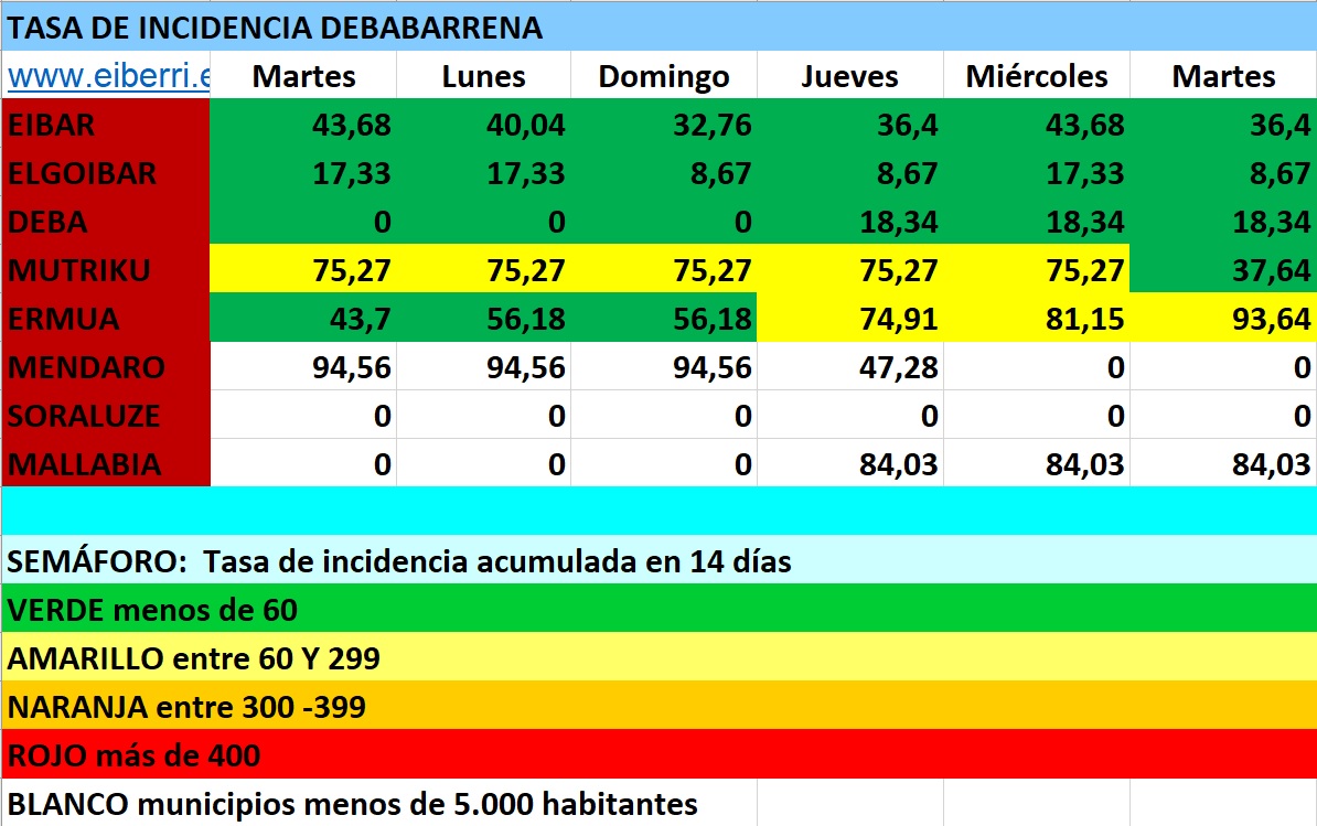 DEBABARRENA.- Los datos siguen bajando en la comarca y ayer solo se registraron 2 positivos, en Eibar y Ermua. También se mantiene la tasa de incidencia y Mutriku sigue siendo el único municipio que se encuentra en la zona amarilla.