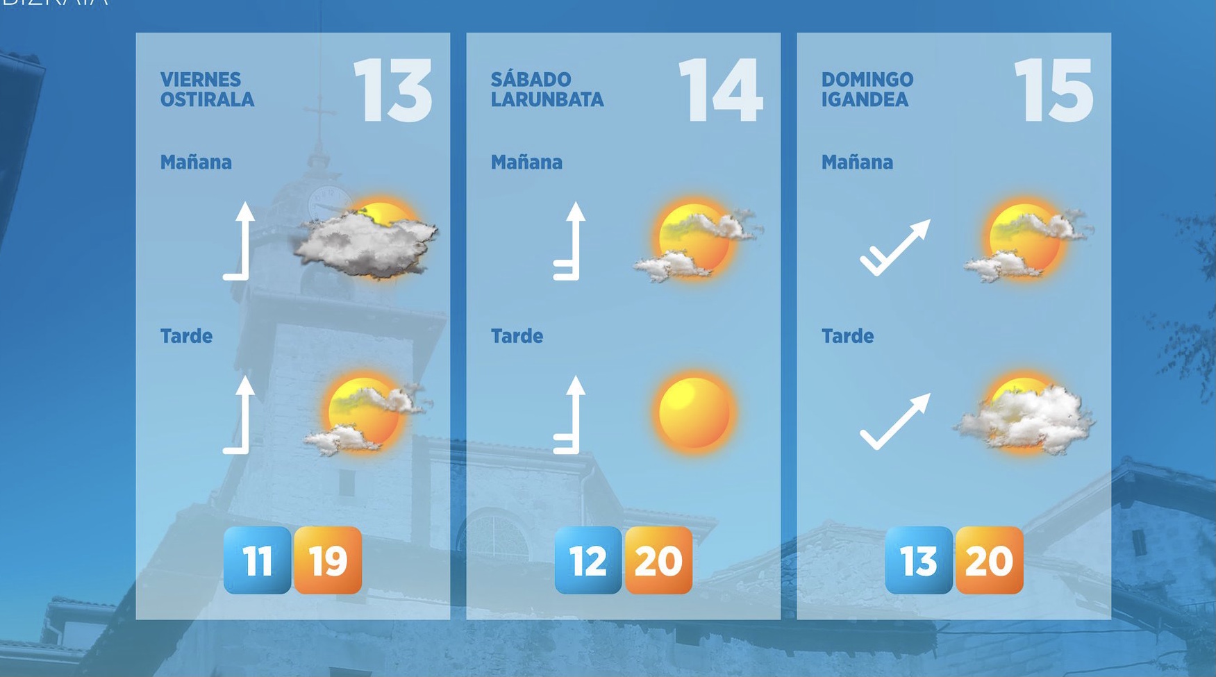 EGURALDIA.- El ambiente suave y el tiempo tranquilo tendrán continuidad el jueves. La nubosidad será escasa y se limitará a algunas nubes altas durante la mayor parte del día, con ligero aumento al final del día. También se formarán nieblas a primeras horas aunque es probable que se disipen por la mañana. El viento de componente sur soplará algo más suave que en la jornada precedente. Pocos cambios en las temperaturas.