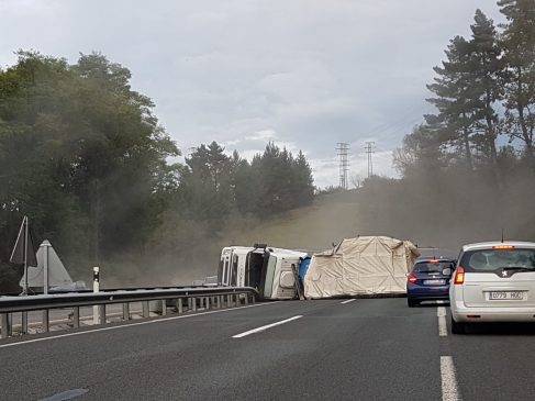 El camión ha chocado contra el coche y tras golpear la mediana ha volcado invadiendo los carriles dirección Donostia