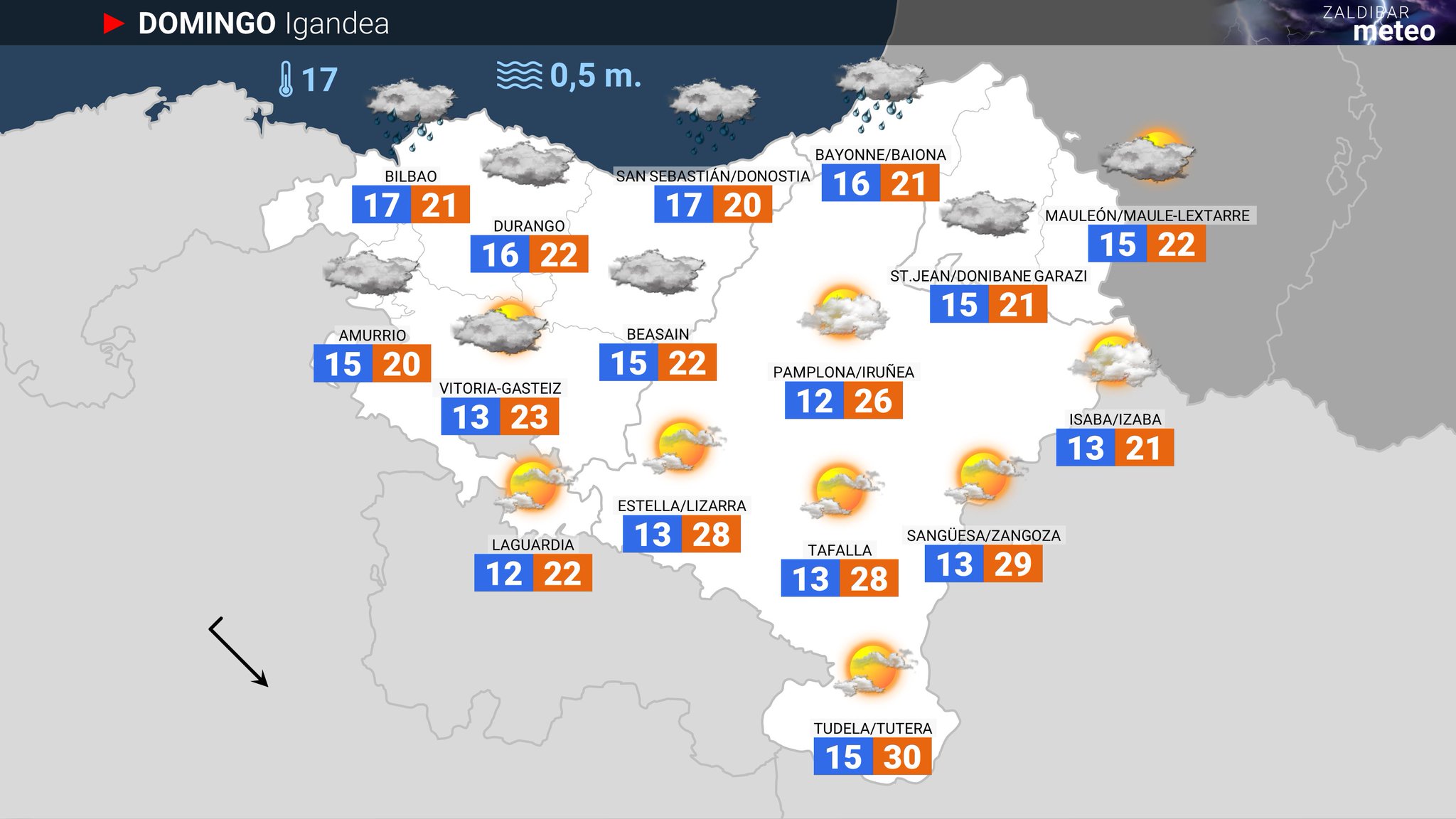 EGURALDIA | El domingo no se esperan tormentas, pero el tiempo será gris, con abundante nubosidad de tipo bajo; al mediodía se abrirán algunos claros, pero a partir de la tarde volverán a ganar terreno las nubes. Es probable que llueva de manera débil y ocasional, sobre todo en la costa. En la mitad sur, nubes y claros, sin lluvia y con ratos soleados; a primeras horas del día pueden aparecer algunos bancos de niebla. Viento del norte a partir de la mañana y temperaturas diurnas un par de grados más bajas.