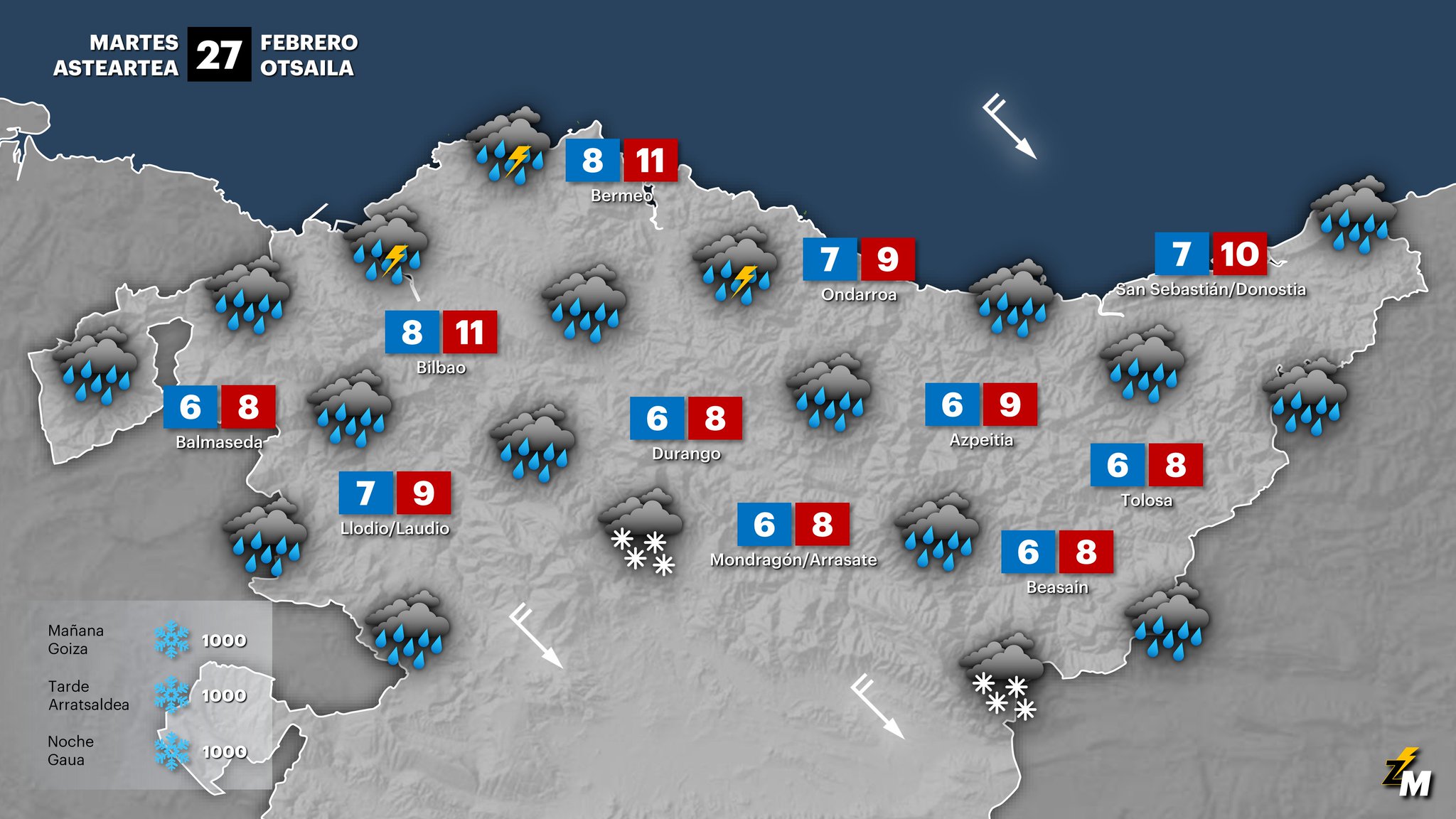 EGURALDIA | El martes seguiremos con lluvia persistente y abundante. Durante la segunda mitad del día y empezando por el oeste, poco a poco la lluvia irá a menos. Aun así, el tiempo seguirá siendo desapacible, con viento del noroeste intenso, sobre todo cerca del litoral. La cota de nieve rondará los 800-1000 m de madrugada y primeras horas, pero irá subiendo progresivamente hasta situarse por encima de los 1000 m por la tarde. Apenas habrá cambios en las temperaturas, seguirán siendo invernales.