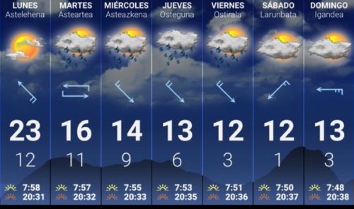 MARTES | El martes cambiarán las tornas y pasaremos de jornadas soleadas a tiempo gris, incluso llegará algo de lluvia. Amanecerá ya bastante cubierto y a partir de la tarde se registrarán precipitaciones, por lo general débiles. Durante la mañana también podría llover de forma ocasional, aunque es menos probable. Ya no estará presente tampoco el viento de componente sur que sostenía las temperaturas en valores muy agradables; en su lugar soplarán vientos de componente norte y oeste ligeros y las máximas se quedarán por debajo de los 20 grados, siendo la bajada de las temperaturas más notoria en Debabarrena.