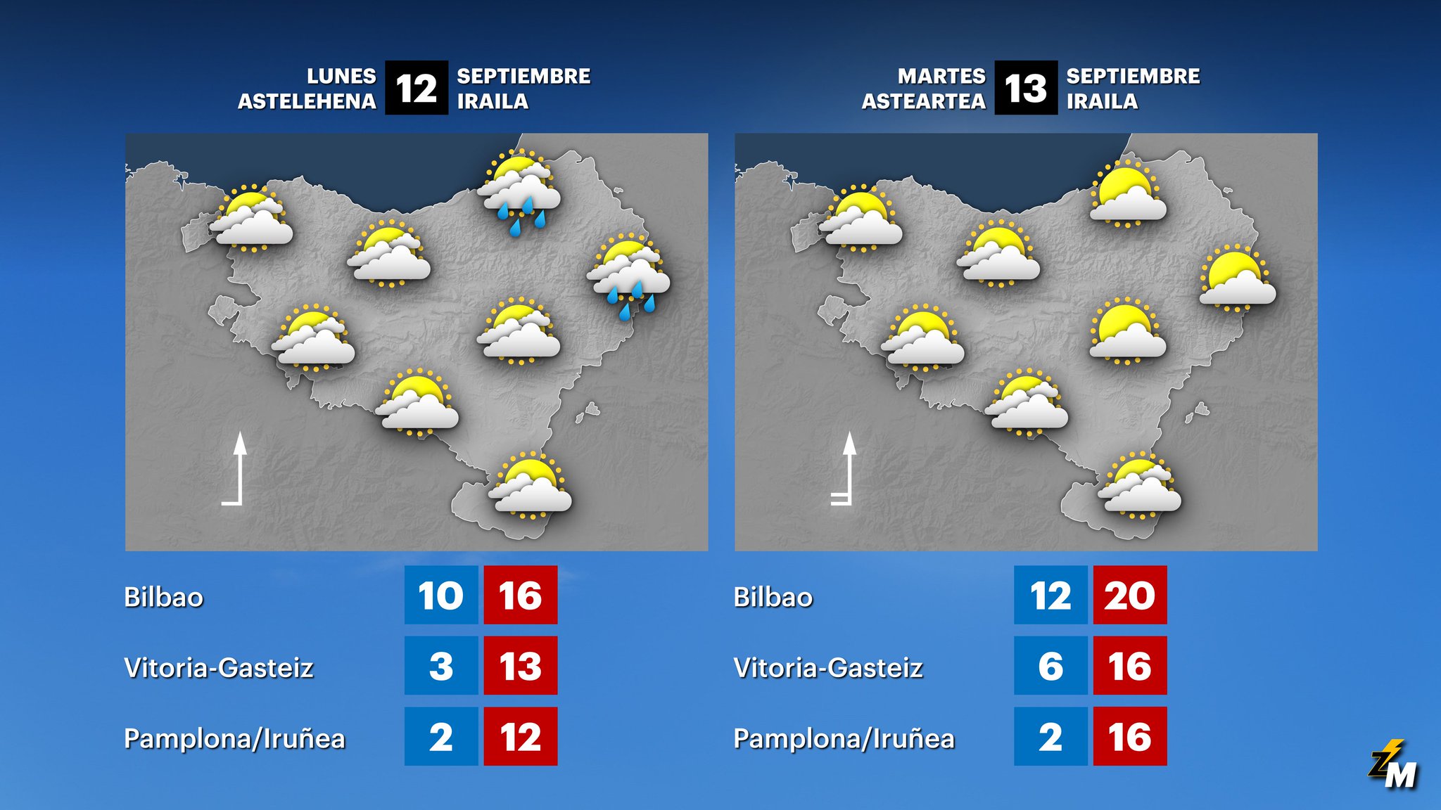 Durante las primeras horas del lunes el viento soplará del sur y aunque las nubes serán abundantes es poco probable que llueva. A lo largo de la mañana el viento girará al oeste o noroeste, con rachas muy fuertes, y comenzará a llover. Cielo nublado durante las horas centrales, con lluvia, sobre todo en la mitad norte. Por la noche remitirá la precipitación, se abrirán claros y el viento se volverá a fijar del sur. Temperaturas máximas 2 o 3 ºC más altas; las mínimas del día se registrarán a últimas horas.