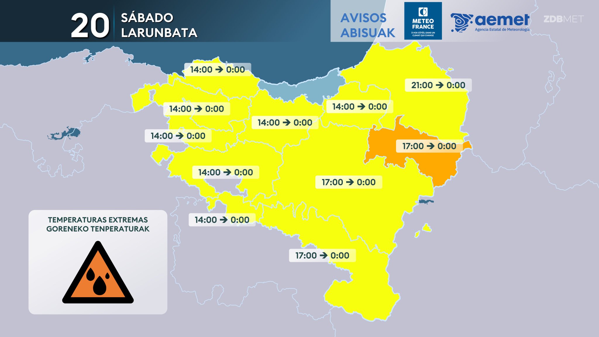 EGURALDIA | El sábado por la mañana el tiempo será tranquilo, y salvo algún chubasco de madrugada, no esperamos lluvia; en el cielo se alternarán las nubes medias y altas. Las temperaturas serán altas desde primeras horas del día debido al viento sur, aunque las máximas se quedarán probablemente por debajo de los 30 ºC en la mayor parte de la región, ya que a durante la mañana el viento irá girando al norte en la costa, y por la tarde en el interior. Tras el giro del viento, se irá nublando y por la tarde-noche se esperan chubascos, que pueden ser tormentosos e intensos; no se descarta alguna granizada. También descenderán las temperaturas y las mínimas del día se registrarán a últimas horas.
