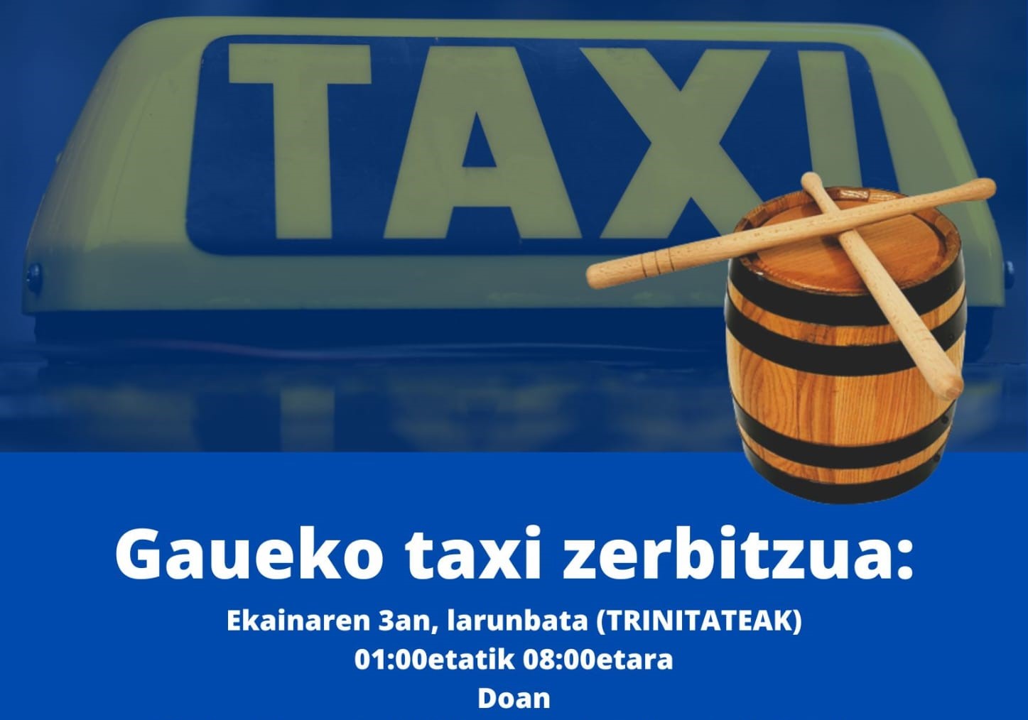 ELGOIBAR | El Ayuntamiento de Elgoibar ofrecerá, tras la valoración positiva realizada en las fiestas de San Bartolomé, el día de Nochevieja y en Carnavales, un servicio nocturno de taxi en las Trinidades. Concretamente el 3 de junio, sábado. Estará disponible de 01:00 a 08:00 horas y el servicio sólo servirá para realizar recorridos urbanos. Será gratuito y partirá de la rotonda de Txarriduna. No se podrá hacer reserva previa, habrá que estar en la cola del servicio y se podrá coger el taxi por orden de llegada.